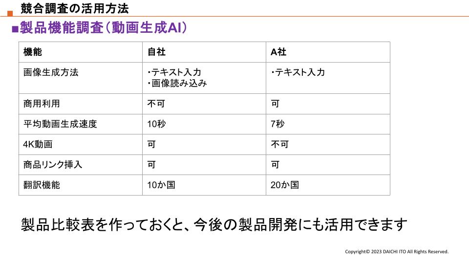 競合調査では4Pの視点から競合を分析するとともに、製品・サービスの機能を比較しておくことをおすすめします。整品・サービスの機能を把握しておくことで、キャッチコピーやクリエイティブ作成に活用できます。競合とバチバチにぶつからざるを得ない時は、特に重要な分析です。