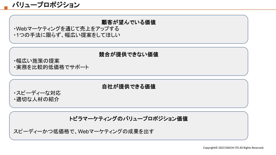 トビラマーケティングの場合「スピーディかつ低価格で、Webマーケティングの成果を出す」というバリュープロポジションを掲げました。